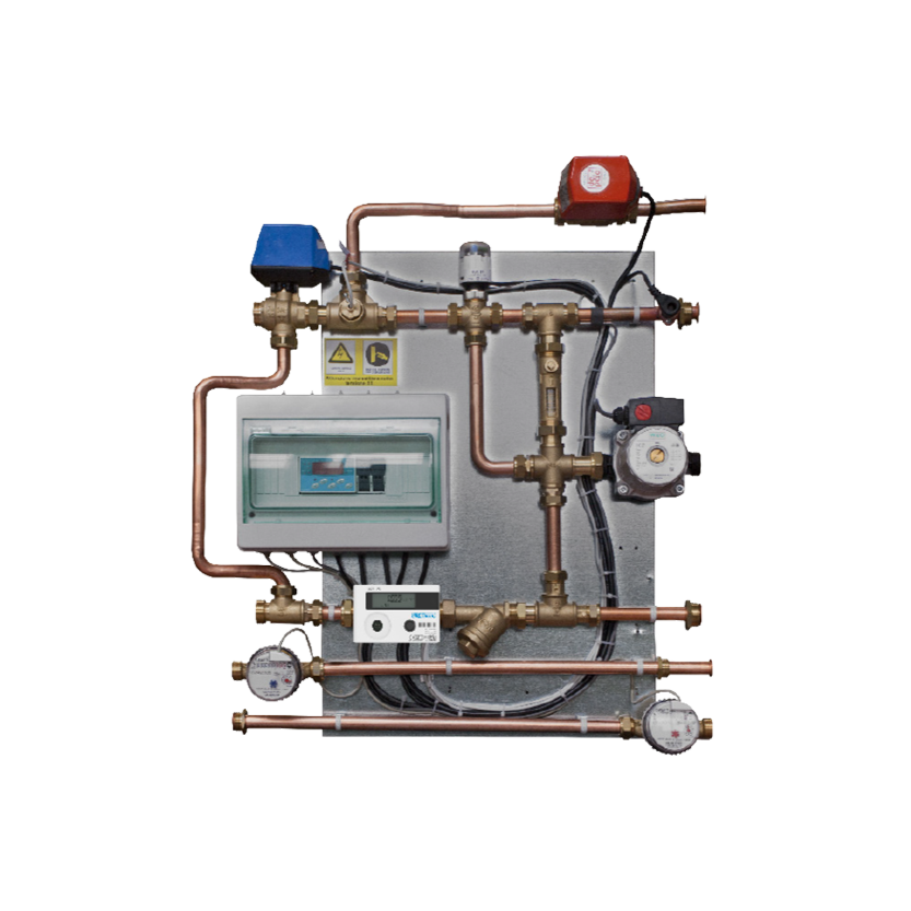 Modulo per la contabilizzazione di energia termica, frigorifera ed acqua calda e fredda sanitaria. Comprensivo di sistema di abbattimento della temperatura per impianti a pavimento, in versione a punto fisso termostatico o regolazione climatica. Con stacco per alta temperatura.